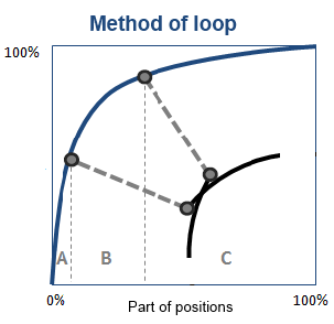 Method of loop solves problem of optimal segmentation on two groups – low and high values. As a base for this method taken curvature of a curve definition, which defined by its radius. Goal of this method – allocate such segment on Pareto Chart, which has maximal curvature (lowest radius of curvature), that is segment of conversion from more vertical (sharp) part of chart to more horizontal (flat). Such definition of task absolutely corresponds to goals of ABC-analysis, because objects with high values of results allocated on sharp part of diagram, with low – on flat.
