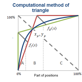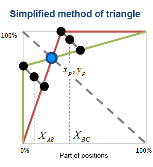 Method of triangle can be easily automated. Using formulas (3) and (4) we can build table of correspondence of Pareto points coordinates and values of groups A, B and C. Thus, task can be transformed into search of Pareto Point coordinates.